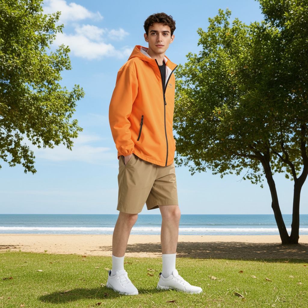What sets these manufacturers apart is their emphasis on breathable, waterproof materials that allow moisture to escape while blocking rain. For instance, the vibrant orange hooded windbreaker from Nanjing Zhengyu features a sleek zip-front closure and zippered side pockets, making it ideal for brisk outdoor activities. This lightweight raincoat doesn't just protect; it adds a pop of color to casual outfits, pairing seamlessly with khaki shorts and white sneakers for an effortless, sporty look. By prioritizing functionality without sacrificing aesthetics, lightweight raincoat manufacturers like this one cater to modern lifestyles where versatility is key.